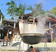 湯立神事とは、神前に置いた大釜に湯を煮えたぎらせて笹の葉をひたし、社殿や参加者に振りかける儀式で、一年の無病息災をお祈りします。